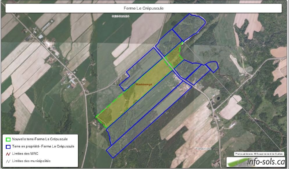 Enfin dans les prochains mois, avec l’acquisition d’un fumoir, je serai en mesure de procéder au fumage de nos produits déjà offerts, ici-même, dans nos installations. Voir image jointe des terres, en vert pâle, la nouvelle terre acquise par la F.L.C.